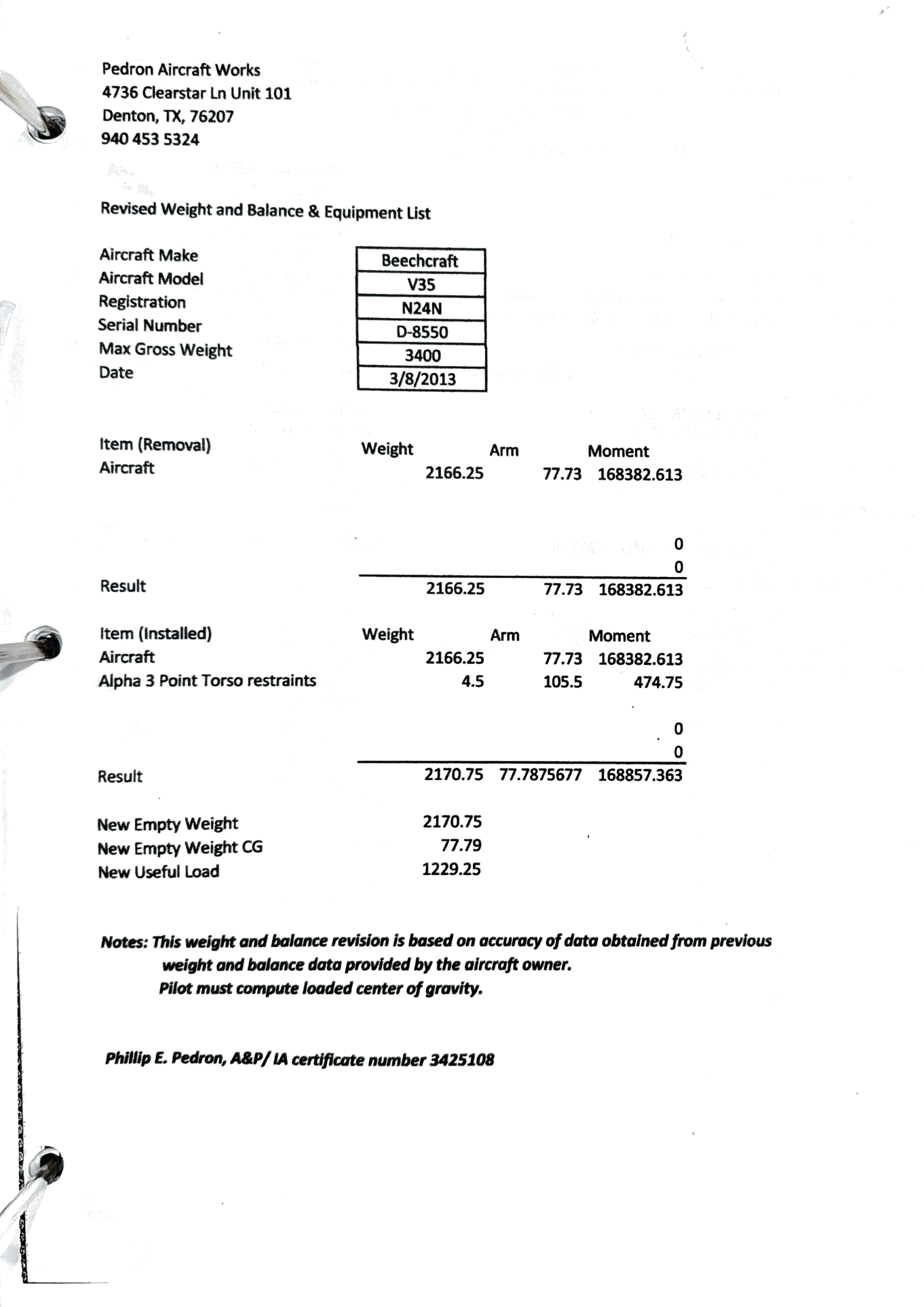 - Weight & Balance: Download PDF